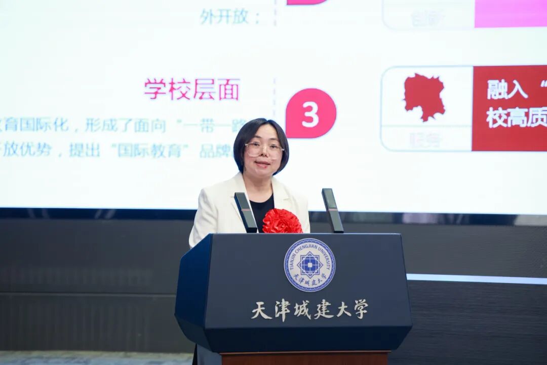 先进基层党组织荣誉称号获得单位、国际工程学院党总支书记杨萍作为二级党组织书记代表,讲述了自己认真履行党建第一责任人职责,班子成员团结协作、勇于担当、积极作为,推动中外合作办学事业蓬勃发展,以“国工行动”奋力谱写“天城大”教育国际化崭新篇章的生动故事。